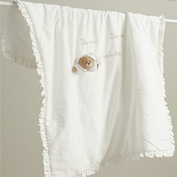 La copertina invernale è una morbida coperta di colore panna, in jersey impreziosita dall’applicazione dell’orsetto Tato e da due cuoricini. Un manto morbido e caldo, nel quale avvolgere il bebè, per farlo sentire sempre protetto anche durante le notti e i pomeriggi invernali. Gli amici d’infanzia avvolgono di tenerezza e divertimento ogni momento della giornata del tuo bebè. Dimensioni: 70x80cm